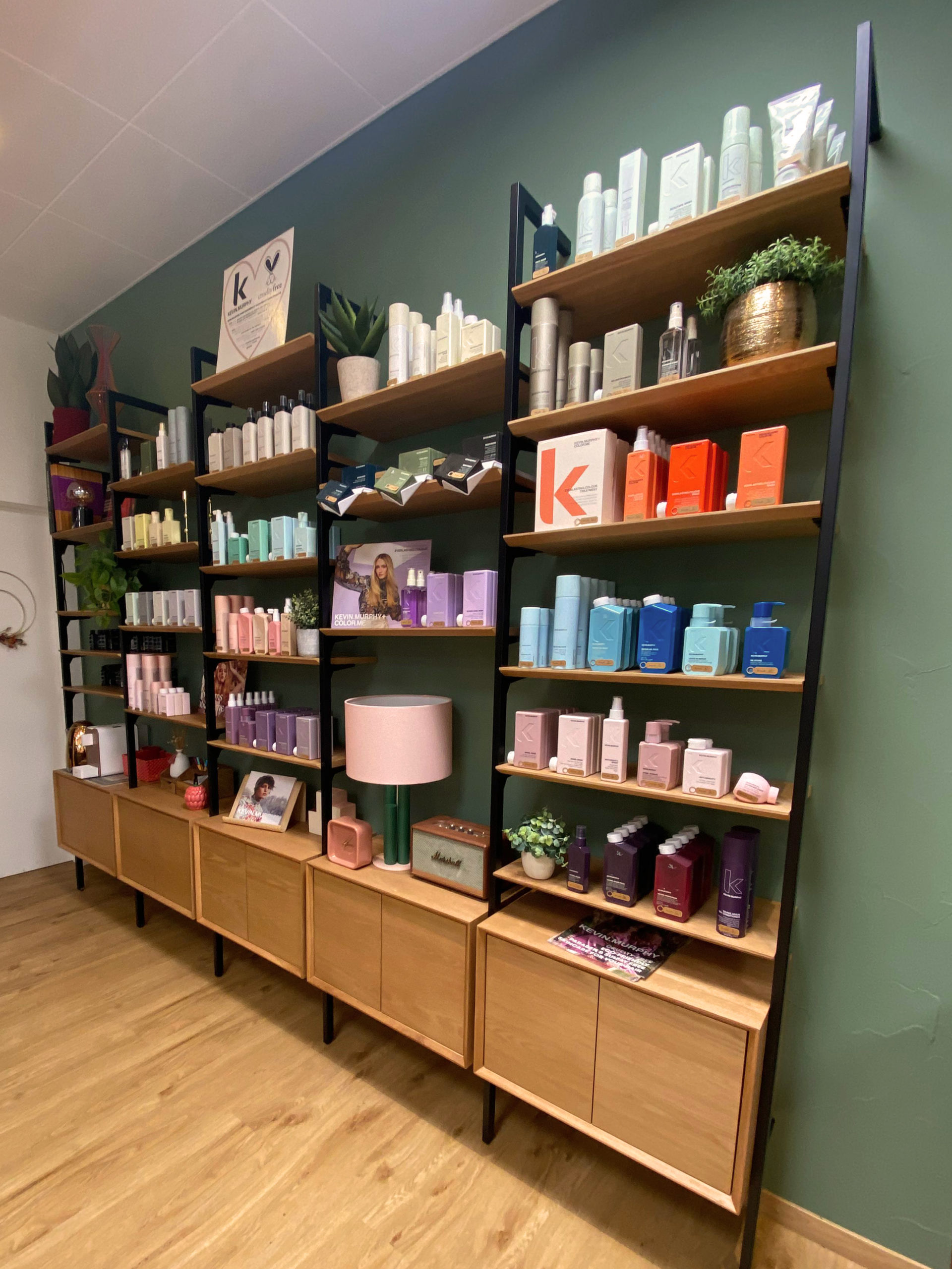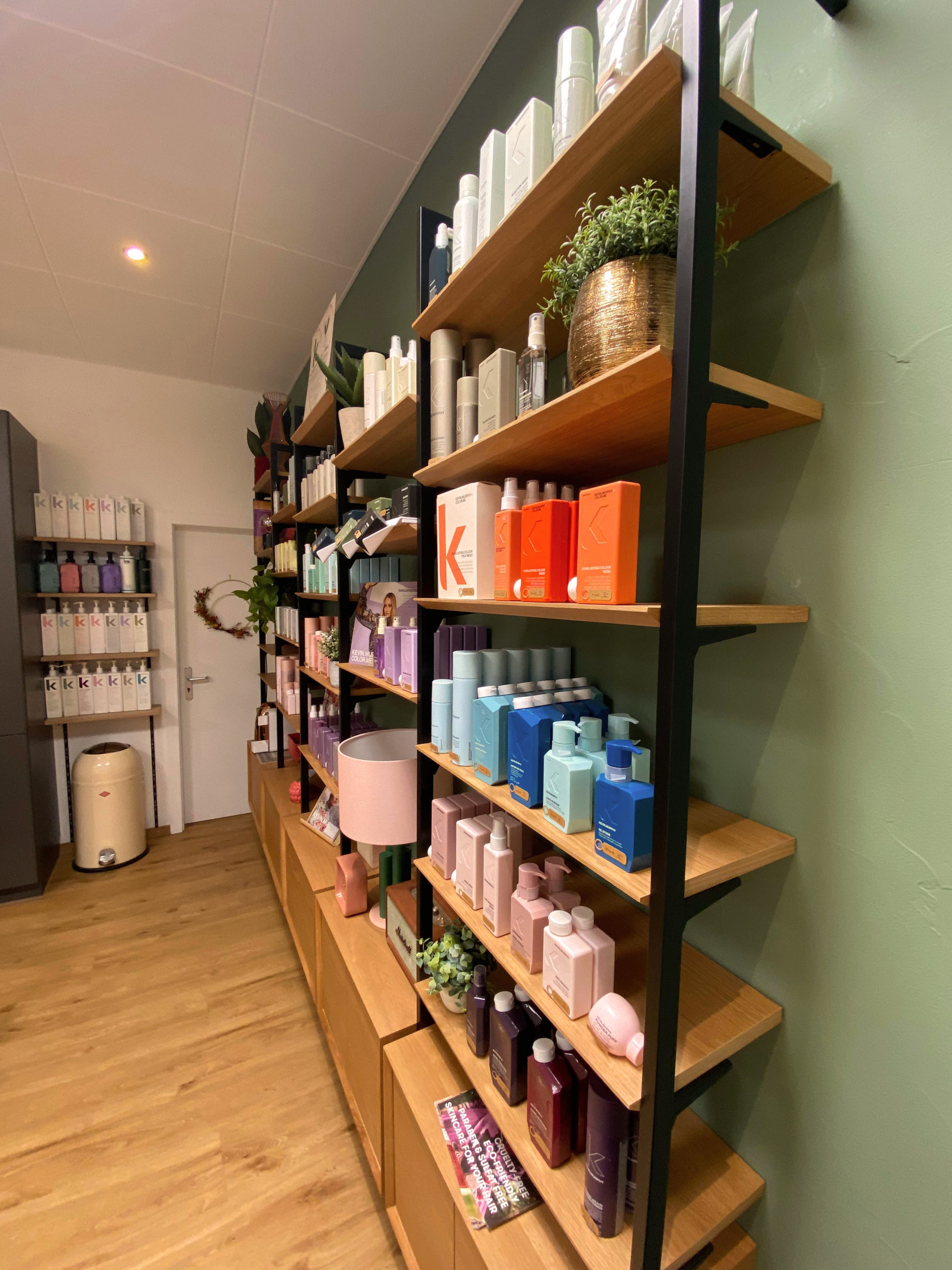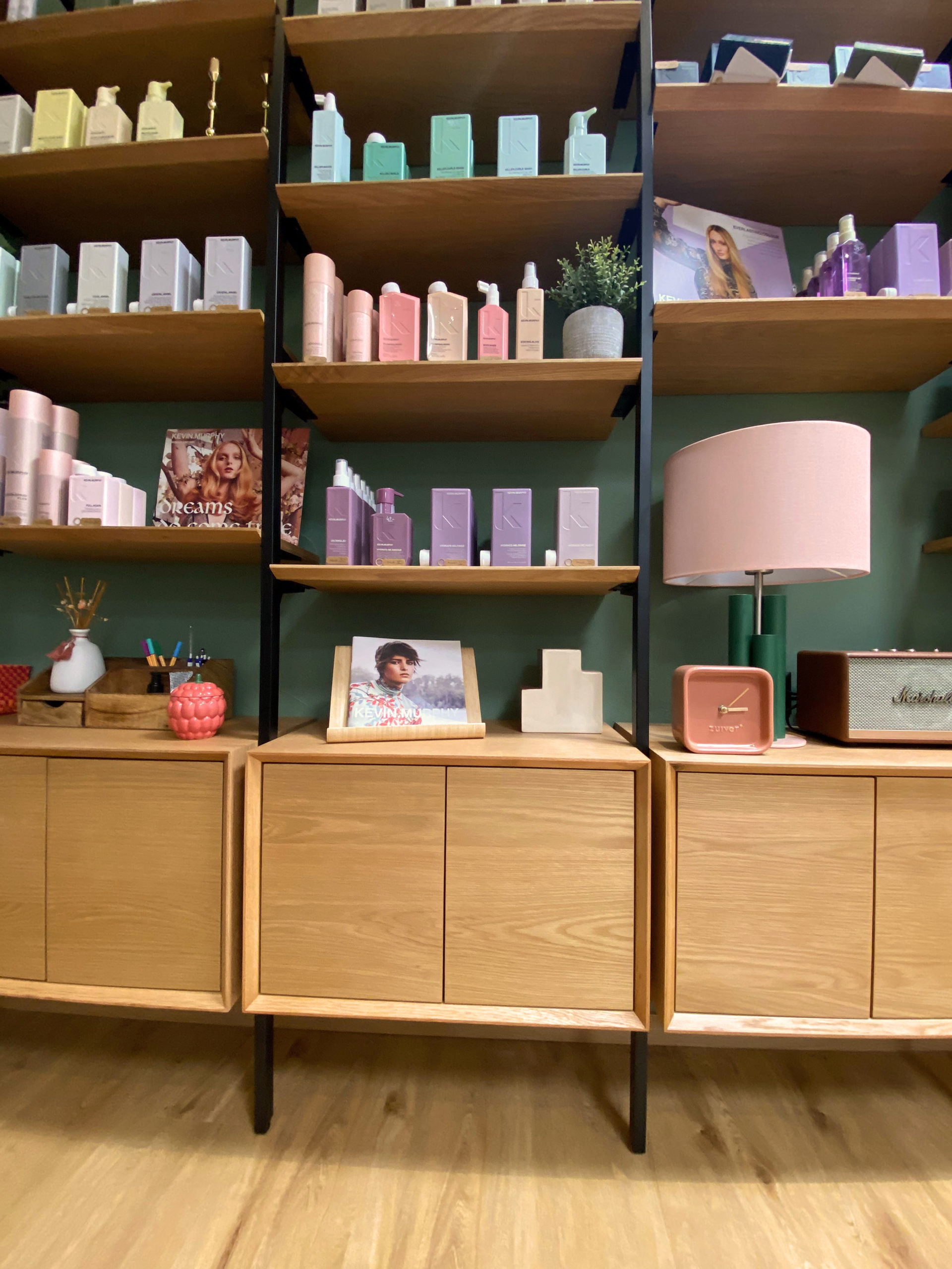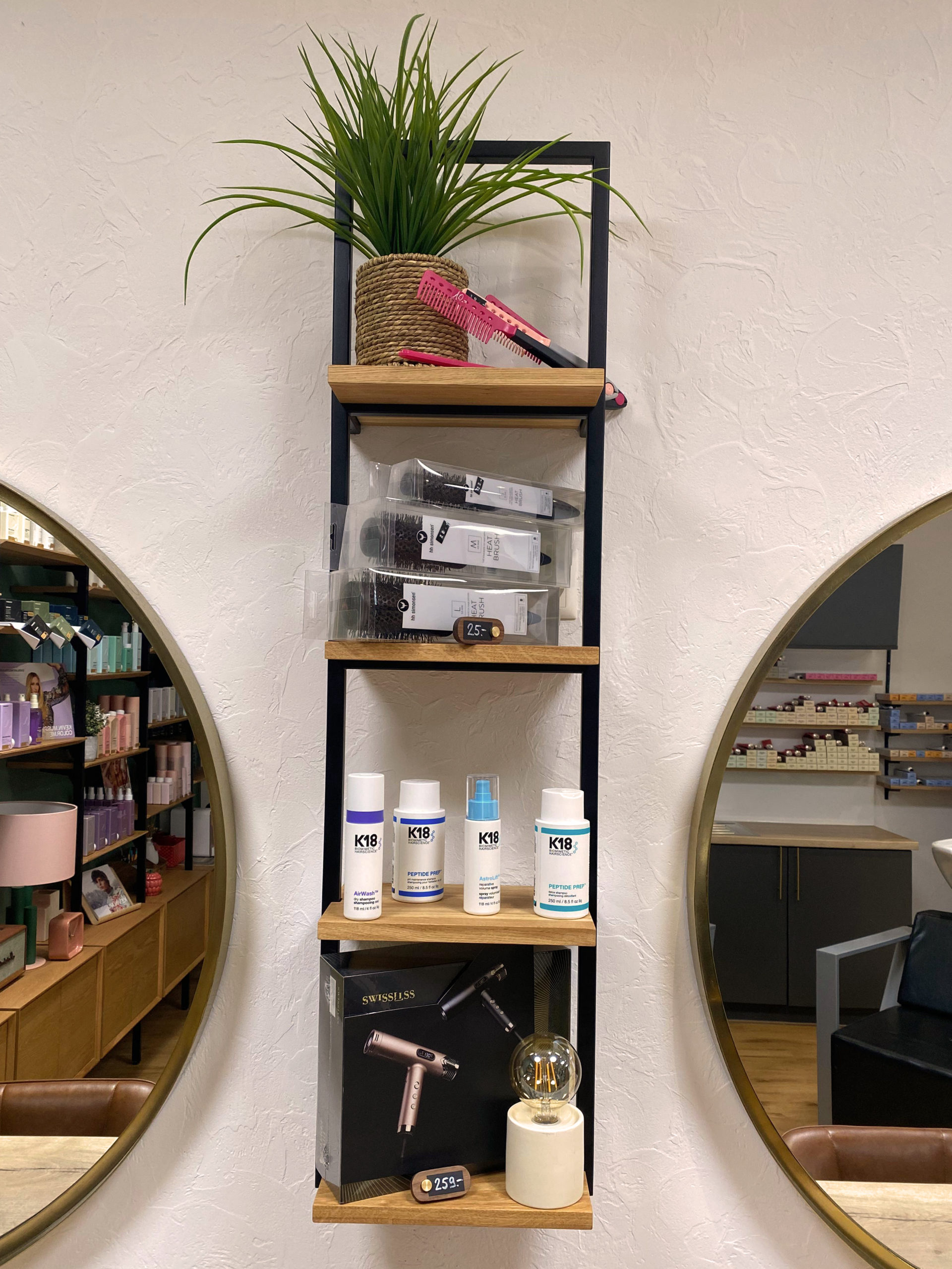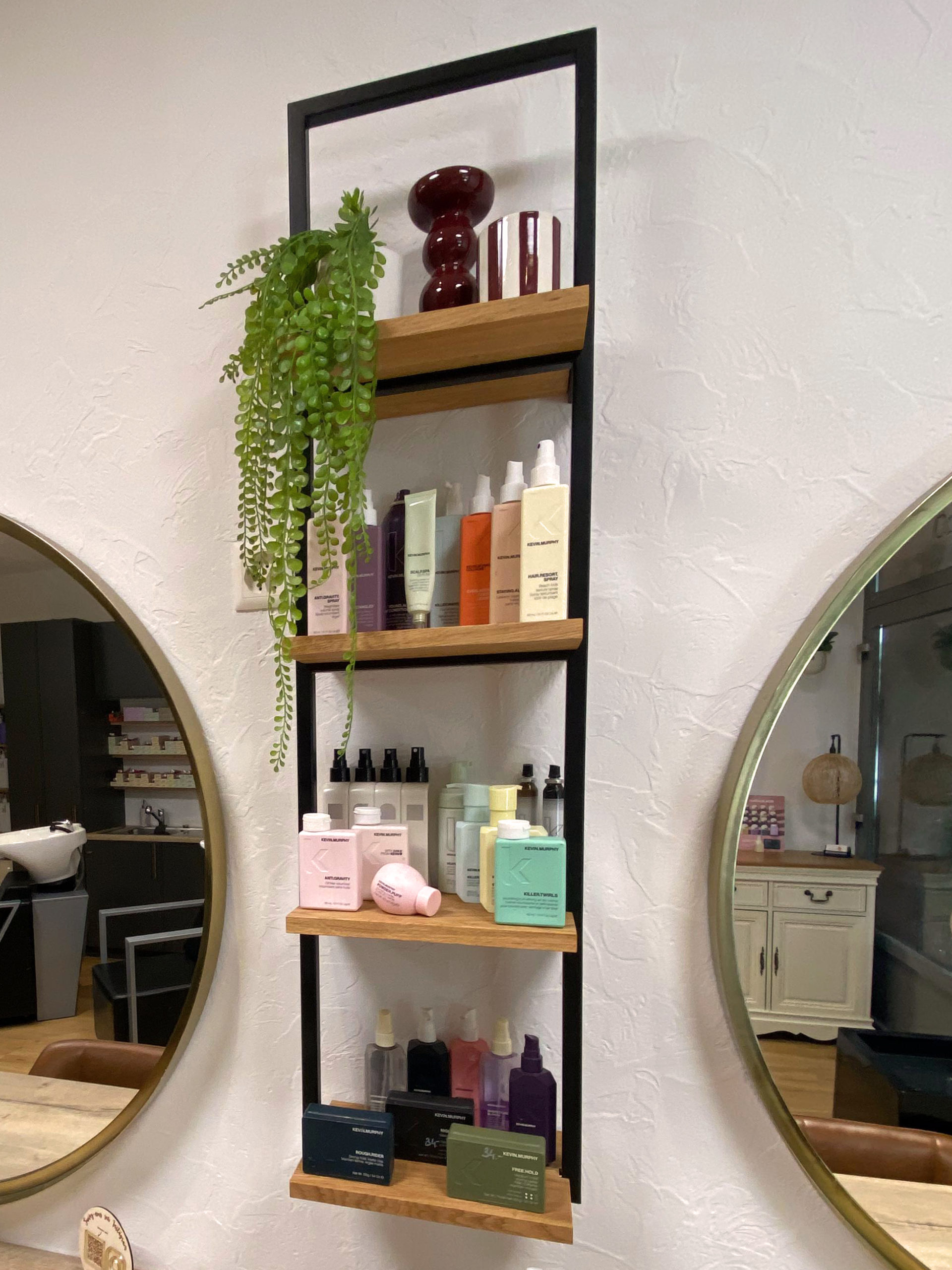 Transformation d’un salon de coiffure en un espace sobre et contemporain, avec une ambiance harmonieuse. L’agencement intérieur a été uniformisé avec une structure filaire en métal noir et des éléments en chêne, installés face à l’entrée pour exposer clairement les produits. Des structures aériennes légères entre les miroirs permettent de proposer des produits complémentaires, renforçant le style du salon. Chaque élément a été choisi pour créer un environnement accueillant et professionnel, séduisant ainsi la clientèle.